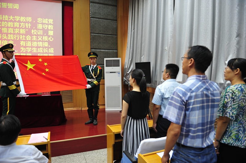 在學(xué)校統(tǒng)一組織帶領(lǐng)下,校區(qū)全體新入職教師面對(duì)國(guó)旗,莊嚴(yán)宣誓,立志做忠誠(chéng)黨的教育事業(yè)、帶頭踐行社會(huì)主義核心價(jià)值觀的“四有好老師”,為學(xué)生成長(zhǎng)成才,為學(xué)校事業(yè)發(fā)展,為國(guó)家繁榮、民族振興貢獻(xiàn)智慧和力量。