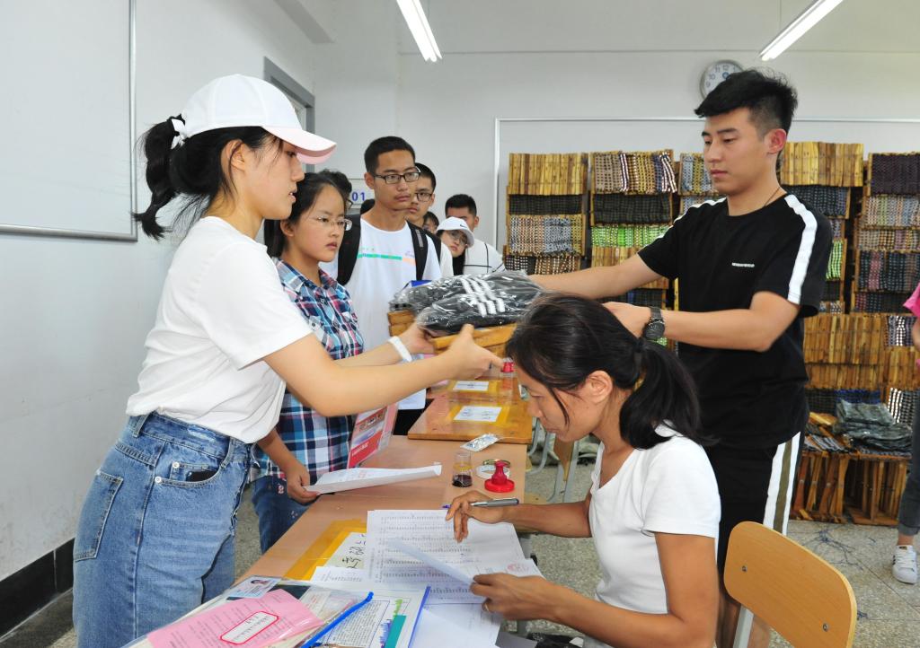 志愿者為新生辦理報(bào)到手續(xù)、發(fā)放軍訓(xùn)物品