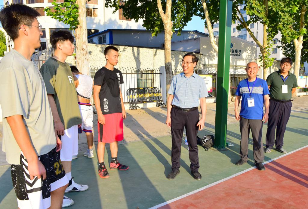 孫鶴汀一行先后到學(xué)生返校查驗(yàn)通道、圖書(shū)館、藝體樓工地施工圍蔽區(qū)、學(xué)生公寓、校園超市、快遞驛站、運(yùn)動(dòng)場(chǎng)、餐廳等場(chǎng)所,全面了解學(xué)生學(xué)習(xí)、生活等重點(diǎn)區(qū)域的運(yùn)轉(zhuǎn)情況和疫情防控工作。在學(xué)生公寓、運(yùn)動(dòng)場(chǎng)、餐廳等處,孫鶴汀與返校學(xué)生親切交流,詳細(xì)詢問(wèn)學(xué)生返校后的學(xué)習(xí)生活情況,希望他們盡快適應(yīng)返校生活,珍惜寶貴時(shí)間,刻苦學(xué)習(xí)文化知識(shí);加強(qiáng)體育鍛煉,增強(qiáng)身體素質(zhì),以積極樂(lè)觀的心態(tài)規(guī)劃好常態(tài)化疫情防控下的學(xué)習(xí)生活。