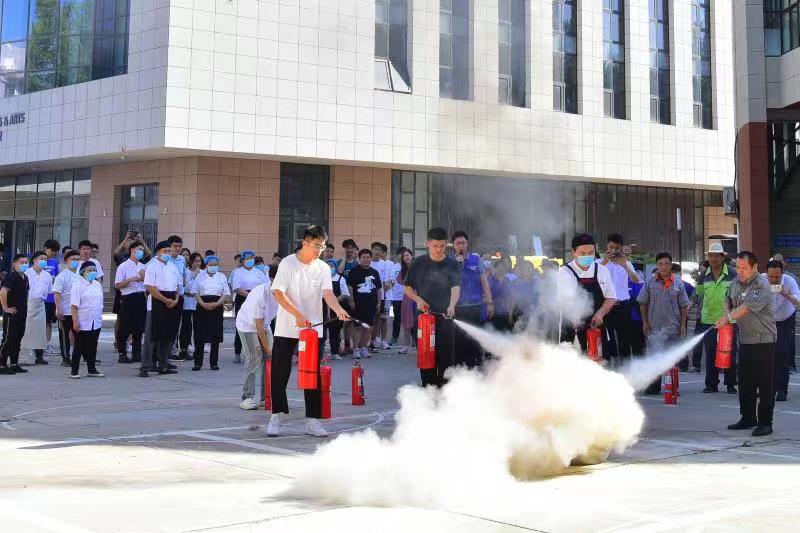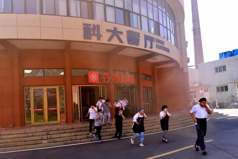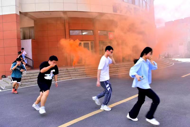 此次演練活動(dòng)模擬學(xué)校餐廳一樓廚房因電氣線路短路故障引發(fā)火災(zāi)的消防疏散場景,隨著橘黃色的濃煙在餐廳門口升起和消防警報(bào)響起,餐廳內(nèi)師生員工依照逃生規(guī)范,依次從各樓層有序撤出并迅速轉(zhuǎn)移到餐廳東小操場。隨后,在現(xiàn)場主持人的指導(dǎo)下,演練人員學(xué)習(xí)了滅火器的正確操作規(guī)程,并使用滅火器進(jìn)行了滅火演練。
