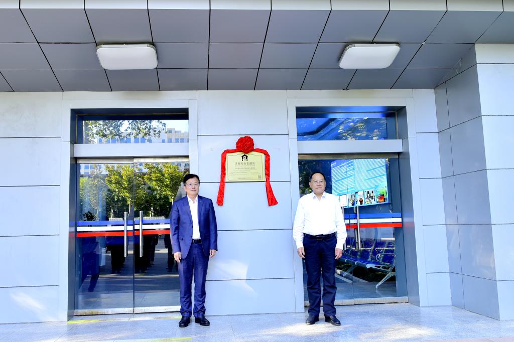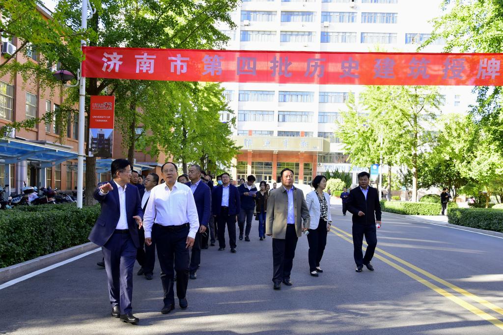 授牌儀式結(jié)束后,劉念成、徐龍飛共同為校區(qū)歷史建筑揭牌,與會(huì)領(lǐng)導(dǎo)專(zhuān)家現(xiàn)場(chǎng)觀摩歷史建筑,參觀了濟(jì)南校區(qū)校園。