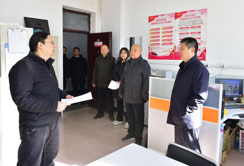 集中座談交流結(jié)束后,梁賽江、郭加書帶領(lǐng)班子成員深入辦公室、實(shí)驗(yàn)室、教研室、教室、消防控制室、藝體樓等處進(jìn)行現(xiàn)場(chǎng)調(diào)研,對(duì)規(guī)范實(shí)驗(yàn)室管理、優(yōu)化環(huán)境等提出具體要求,并要求大家根據(jù)部署安排做好寒假有關(guān)工作,確保校園安全穩(wěn)定。(攝影:董俊峰)