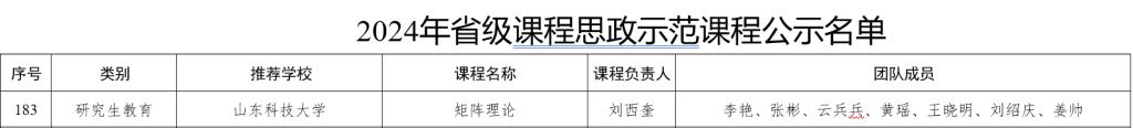 近日,山東省教育廳公布2024年度省級(jí)課程思政示范課程名單。劉西奎教授主持建設(shè)的課程《矩陣?yán)碚摗帆@評(píng)山東省課程思政示范課程研究生教育課程。