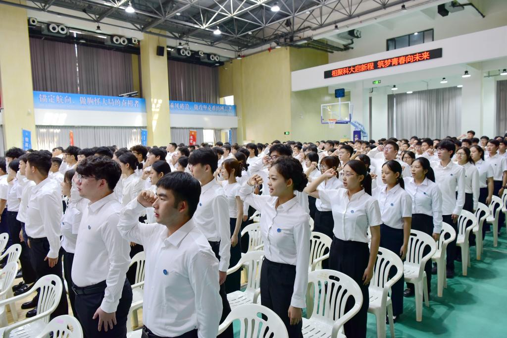 全體新生面對國旗莊嚴宣誓,在鏗鏘有力的青春誓言中,2025級新生開學(xué)典禮圓滿結(jié)束。