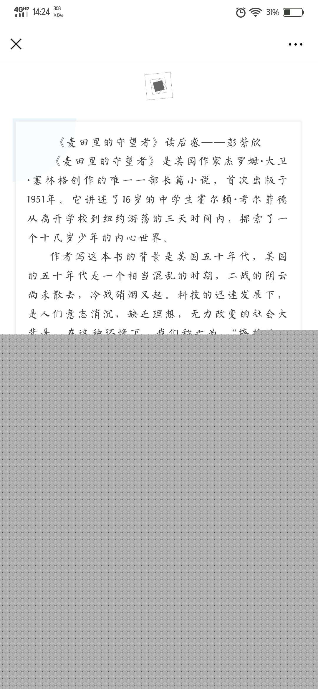 彭紫欣同學以“守得初心,本色依舊”為主題分享了《麥田的守望者》的感悟?;魻栴D一個被學校開除的問題少年,混跡于紐約街頭,看上去好像已經(jīng)墮落,但似乎又不是這樣。“前路雖罔夢想在,麥田守望正氣昂?!彼€愛著他的弟弟妹妹,他還捐錢,還討厭社會上的那些偽君子,他的心還是善良的,還是憧憬著光明的未來的,最重要的是他也還有著夢想。正是從此中她被給予了“守望”的初心和堅持自我的勇氣;
