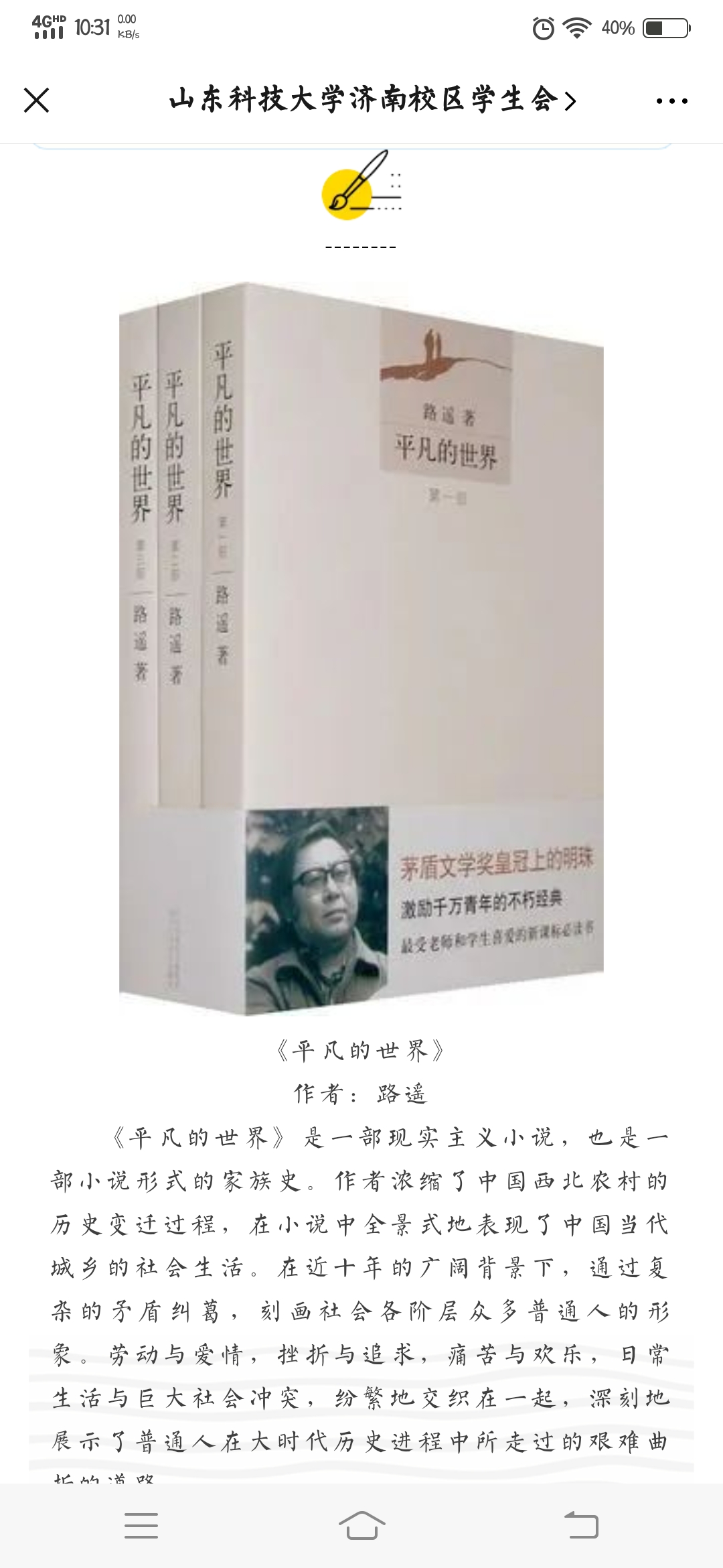 “眾志成城,共克時艱”,新冠肺炎疫情牽動著全國人民的心。而在全國上下共同抗擊新冠肺炎的戰(zhàn)“疫”中,如何做到停課不停學,使同學們在這個特殊的假期中“宅”而 “不荒”、“宅”而“有得”?濟南校區(qū)學生會為此開展了品讀經(jīng)典讀書活動,引導廣大同學好讀書、讀好書,形成讀書熱潮,從“讀他人”到“思己生”,從“感受文化”到“體味情感”,豐富線上與線下學習活動。