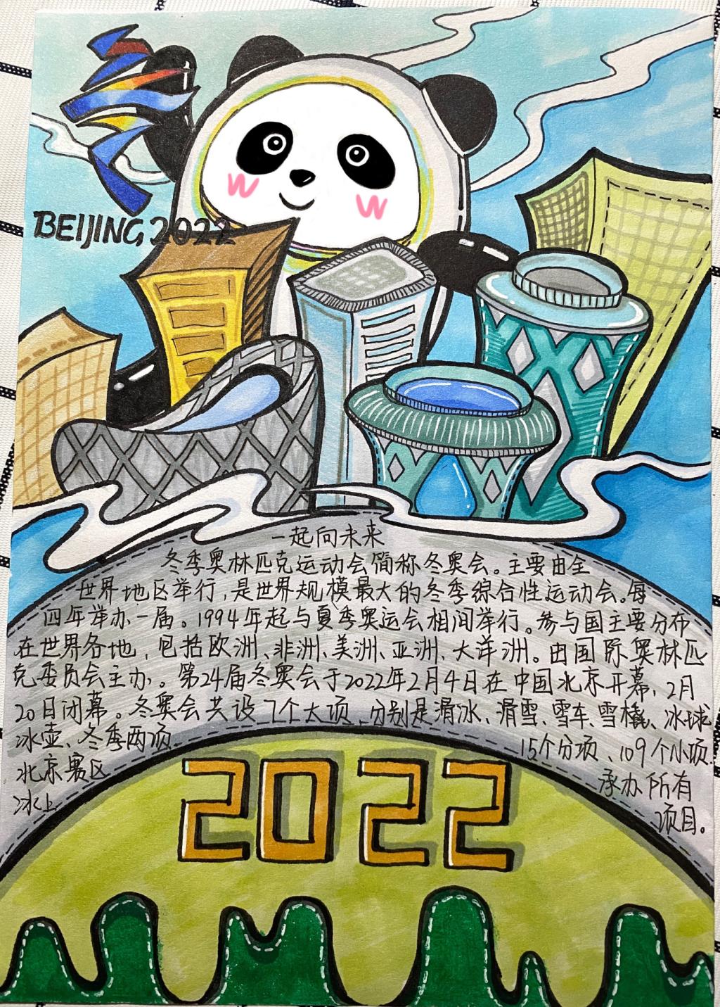 正值寒假,但同學(xué)們的熱情不減,踴躍參與,共征集到269件作品。其中手繪作品51件,知識宣傳作品102件,自制小視頻29件,攝影作品31件。同學(xué)們的藝術(shù)創(chuàng)作各具特色,精彩紛呈,洋溢著無限的青春活力,也飽含了對冬奧盛會的祝福。