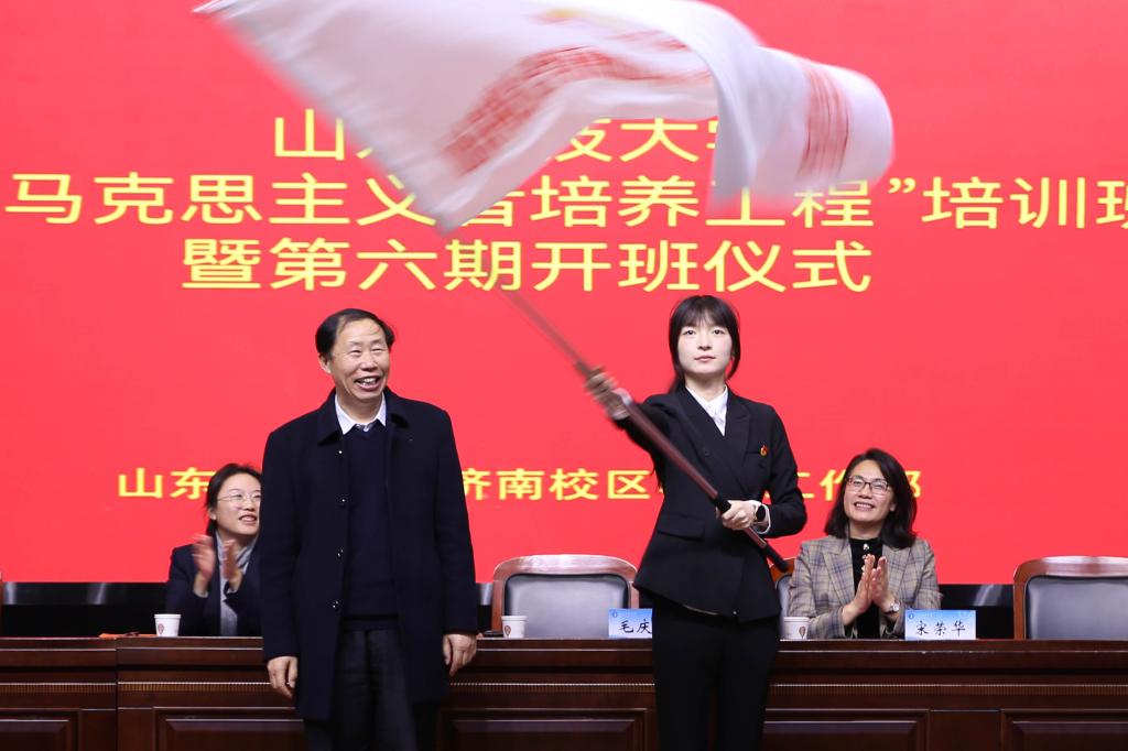 毛慶東為第六期“青馬工程”培訓(xùn)班授旗。校黨委組織部副處級(jí)組織員宋榮華宣讀《關(guān)于表彰第五期“青年馬克思主義者培養(yǎng)工程”優(yōu)秀學(xué)員的決定》。校團(tuán)委副書記、濟(jì)南校區(qū)學(xué)團(tuán)工作部副主任韓冰布置第六期“青馬工程”培訓(xùn)班工作安排。與會(huì)領(lǐng)導(dǎo)為第五期“青馬工程”優(yōu)秀學(xué)員頒獎(jiǎng)。學(xué)員代表馬一鳴進(jìn)行發(fā)言。