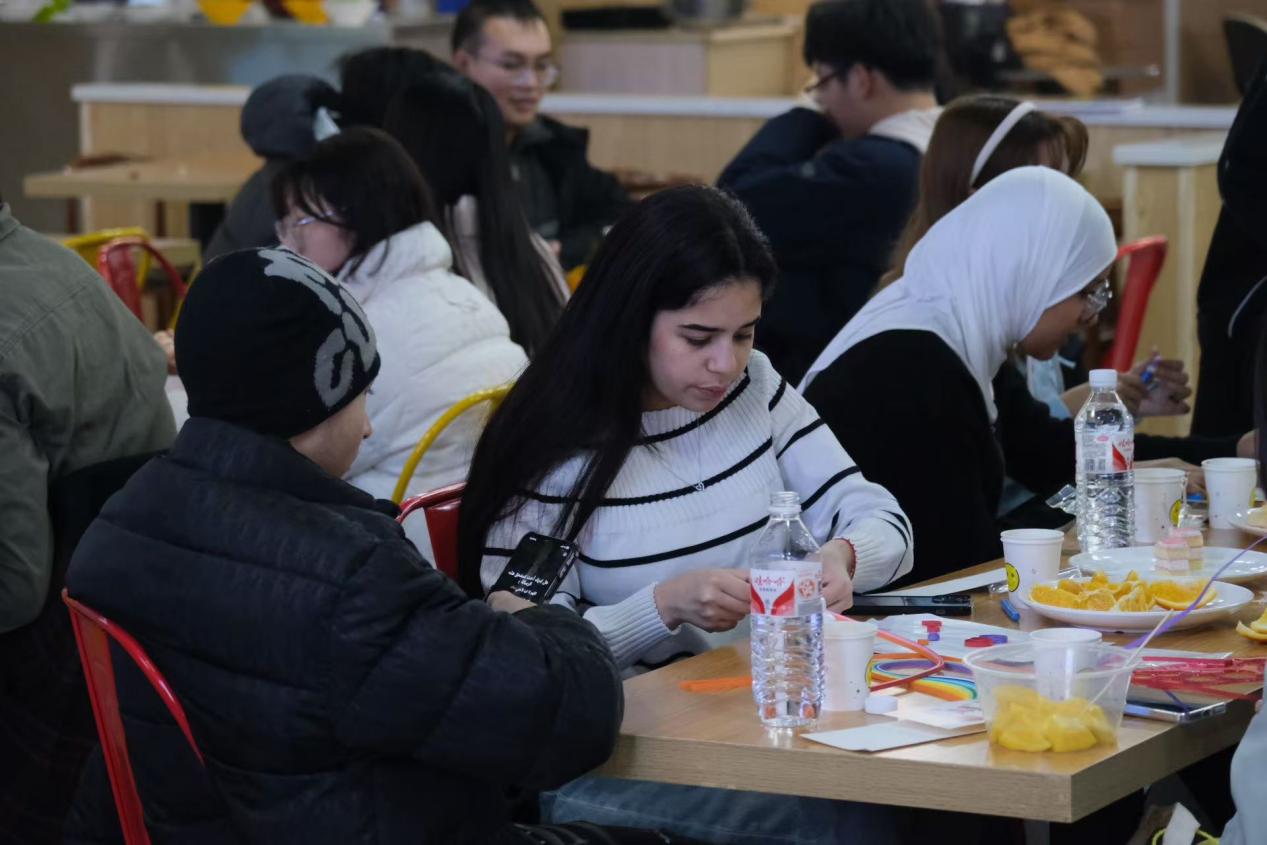 交流環(huán)節(jié)包括點心品嘗和手工制作。各類精致點心與裊裊香茗相得益彰。同學(xué)們在品味美食的同時,以英語為紐帶,暢所欲言?,F(xiàn)場歡聲笑語此起彼伏,語言與美食相互交融,不僅有效拉近了同學(xué)們之間的距離,更促進了不同思想觀念的碰撞與交流,充分彰顯出文化交流互動的獨特魅力。