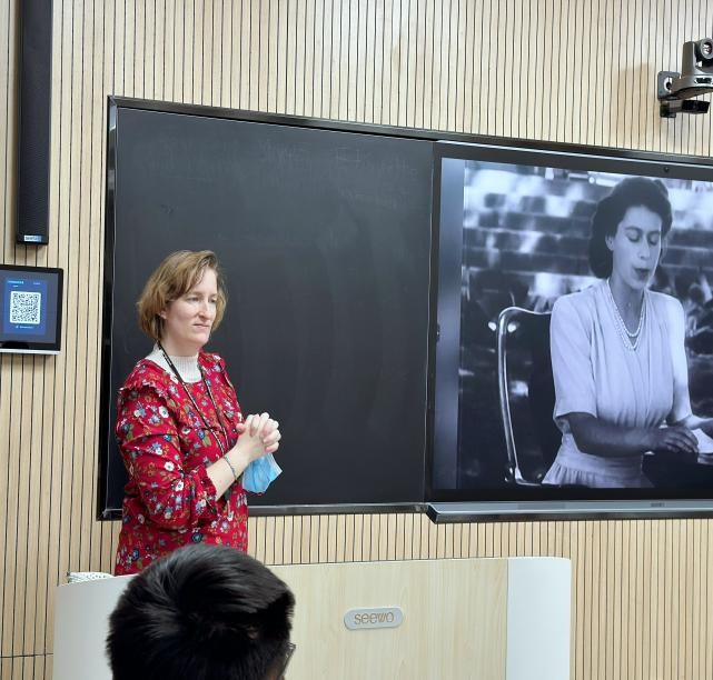 外教Mary在活動開始介紹不同英語口音的規(guī)則,并重點(diǎn)講解英式口音的特點(diǎn)。通過對英女王伊麗莎白和丘吉爾等講話名場面視頻進(jìn)行講解,讓學(xué)生領(lǐng)略了不同口音之美。她生動的講述和專業(yè)的指導(dǎo),引導(dǎo)學(xué)生逐步分析典型的英式發(fā)音方法,特別是在元音和輔音的發(fā)音方式上做了細(xì)致的講解。