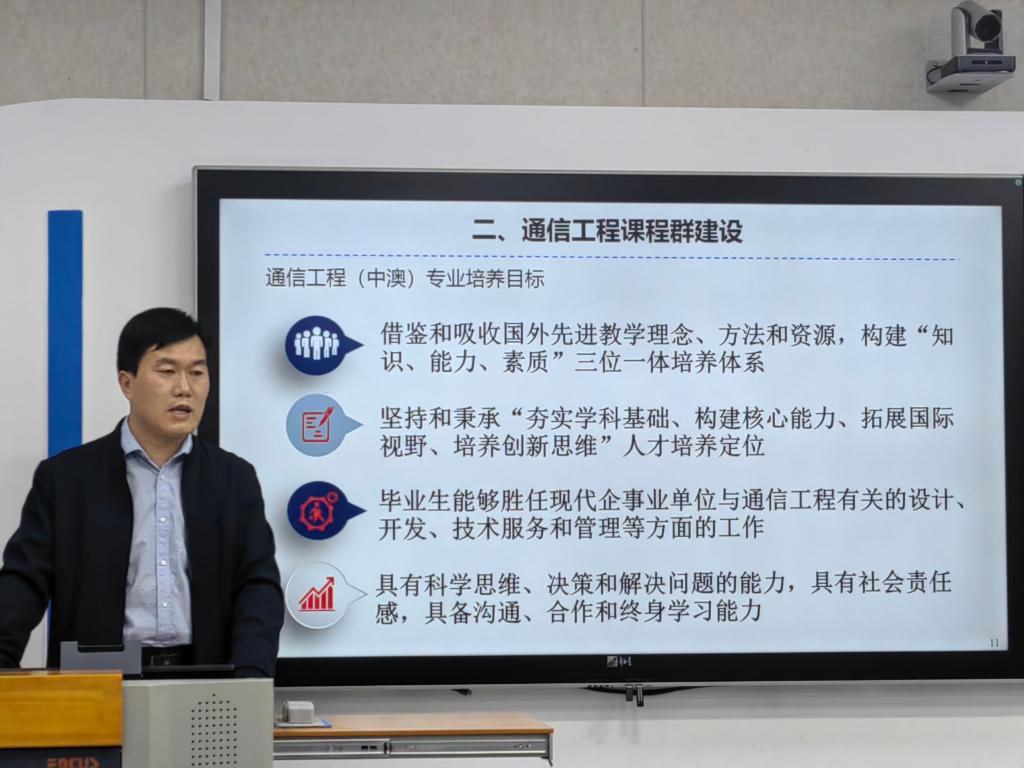 楊金梁首先從課程思政時(shí)代背景切入,講述了通信工程(中澳)專業(yè)發(fā)展歷史、培養(yǎng)目標(biāo)、核心課程體系建設(shè)以及課程思政建設(shè)模式;提出了以學(xué)生為中心,構(gòu)建知識(shí)-能力-素質(zhì)三位一體的人才培養(yǎng)目標(biāo)思路;系統(tǒng)講述了通信工程(中澳)專業(yè)核心課程群的課程思政實(shí)施舉措和思政特色。最后,他還介紹了通信工程專業(yè)核心課程群課程思政的改革成效和創(chuàng)新點(diǎn)。