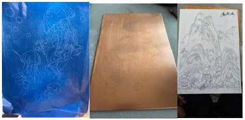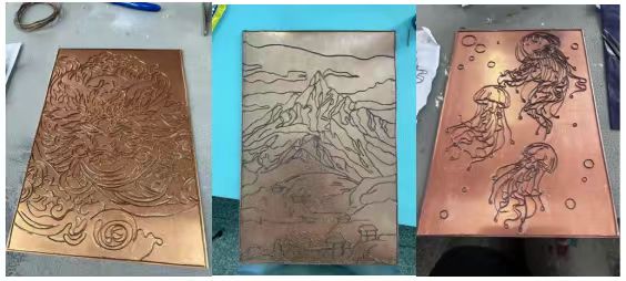 進入實操階段,學(xué)生們在老師的指導(dǎo)下親身體驗制作過程。學(xué)生首先在紫銅板體上繪制紋樣,從幾何圖案到自然元素,風(fēng)格多樣。紫銅板體經(jīng)電爐烘燒淬火后,其延展性顯著增強(硬度降低約30%),使后續(xù)工藝可控性更高。學(xué)生使用專業(yè)工具進行鏨刻、沖壓將平面銅板轉(zhuǎn)化為三維造型。隨后進入精細(xì)銅絲工序,使用鑷子將扁銅絲彎折成設(shè)計輪廓,粘貼于紫銅板體上。這一過程要求極高的精度,以確保線條流暢、結(jié)構(gòu)穩(wěn)固,如圖2所示。