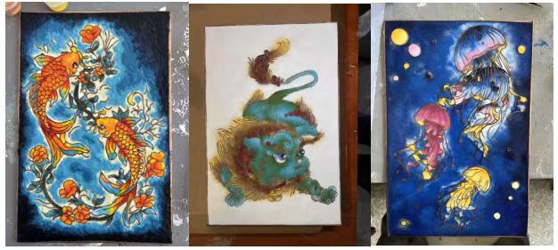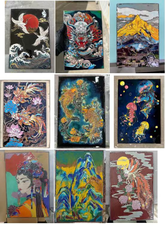 完成造型后,學(xué)生們使用礦物釉料進行填充,礦物釉料的填充是課程的關(guān)鍵環(huán)節(jié)。學(xué)生需根據(jù)色彩搭配需求,將釉料分層填入銅絲框內(nèi),填充時需特別注意礦物釉料稠度控制(水粉比約1:1.5),并通過調(diào)整釉層總厚度(控制在0.8-1.2mm范圍)來避免高溫開裂。釉料的流動性在液態(tài)狀態(tài)下呈現(xiàn)出獨特的漸變效果,為作品增添了豐富的色彩及層次感,如圖3所示。高溫?zé)?/span>階段,釉料在溫度800℃左右中熔融,與金屬胎體結(jié)合,形成光滑的表面。這一過程中,釉料的化學(xué)組成與溫度曲線共同決定了最終成品的色彩飽和度和光澤度。在咼老師的帶領(lǐng)下我們使用專業(yè)的電窯來完成燒制,釉色在高溫下熔融呈現(xiàn)瑰麗光澤。燒制完成后,學(xué)生需進行精細(xì)的后處理:使用400-600目砂紙打磨銅絲表面,露出金屬光澤;針對可能存在的釉料缺陷(如氣泡或色斑),采用材料補加工藝(固體含量約30%)進行局部修繕;最后進行表面清潔和抗氧化處理。