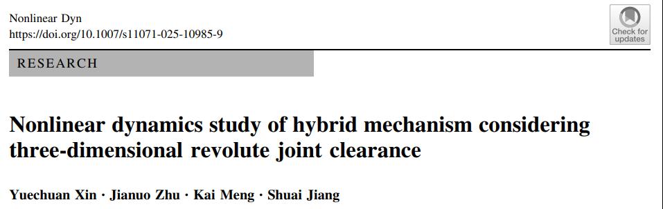 近日,機(jī)械與自動(dòng)化系智能制造技術(shù)實(shí)驗(yàn)室成員2022級(jí)機(jī)械電子工程專(zhuān)業(yè)本科生辛岳川以第一作者身份在國(guó)際知名力學(xué)TOP期刊《Nonlinear Dynamics》上發(fā)表題為《Nonlinear dynamics study of hybrid mechanism considering three-dimensional revolute joint clearance》的SCI二區(qū)學(xué)術(shù)論文(論文通訊作者:姜帥)。