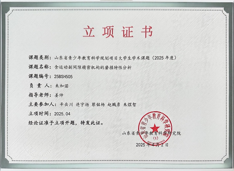此外,機(jī)械與自動(dòng)化系智能制造技術(shù)實(shí)驗(yàn)室成員2022級(jí)機(jī)械電子工程專(zhuān)業(yè)本科生辛岳川、朱加諾等積極參與大學(xué)生學(xué)術(shù)課題,成功申請(qǐng)立項(xiàng)山東省青少年教育科學(xué)規(guī)劃項(xiàng)目大學(xué)生學(xué)術(shù)課題(指導(dǎo)教師:姜帥)。