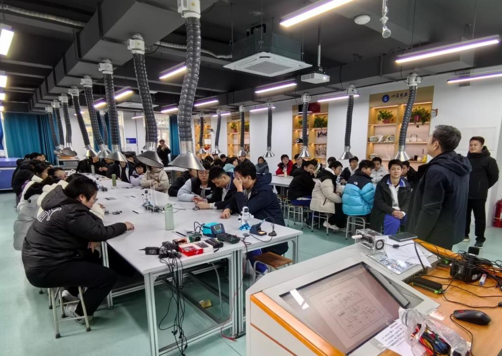 電氣工程及其自動(dòng)化專(zhuān)業(yè)呂英俊教授帶領(lǐng)大家走進(jìn) Project 工程素質(zhì)培養(yǎng)實(shí)驗(yàn)室,近距離觀摩在校本科生自主研發(fā)的機(jī)器人、小型收音機(jī)等兼具創(chuàng)意與技術(shù)含量的科創(chuàng)成果,引發(fā)參觀學(xué)子的廣泛關(guān)注與熱烈討論;在實(shí)踐體驗(yàn)環(huán)節(jié),呂教授親自指導(dǎo)學(xué)子們參與小型收音機(jī)組裝,助力大家在親手完成零件拼接、設(shè)備調(diào)試過(guò)程中,深化對(duì)工程制作嚴(yán)謹(jǐn)性與邏輯性的認(rèn)知,同時(shí)他緊密結(jié)合高中物理學(xué)科核心知識(shí),深入淺出地解析科創(chuàng)作品背后的科學(xué)原理,并寄語(yǔ)學(xué)子們夯實(shí)學(xué)科基礎(chǔ)、樹(shù)立遠(yuǎn)大志向,未來(lái)主動(dòng)投身高等教育深造、深耕專(zhuān)業(yè)領(lǐng)域,以青春之力助力國(guó)家發(fā)展,為實(shí)現(xiàn)中華民族偉大復(fù)興的中國(guó)夢(mèng)貢獻(xiàn)力量。
