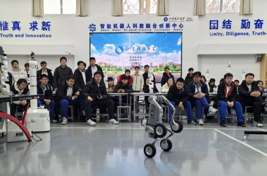 在智能機(jī)器人科教融合創(chuàng)新中心,自動(dòng)化專(zhuān)業(yè)張帥帥副教授圍繞智能機(jī)器人行業(yè)發(fā)展趨勢(shì),系統(tǒng)講解了該領(lǐng)域的研發(fā)歷程、關(guān)鍵技術(shù)突破及多元應(yīng)用場(chǎng)景,幫助學(xué)子們?nèi)嬲J(rèn)知人工智能產(chǎn)業(yè)發(fā)展現(xiàn)狀。在技術(shù)演示環(huán)節(jié),Unitree G1人形機(jī)器人、Unitree Go2-W四足機(jī)器人、TRON1多形態(tài)機(jī)器人,全方位展現(xiàn)了智能機(jī)器人技術(shù)的前沿發(fā)展成果。精彩的演示贏得現(xiàn)場(chǎng)學(xué)子的陣陣掌聲,有效激發(fā)了大家探索科技前沿、投身創(chuàng)新實(shí)踐的濃厚興趣。