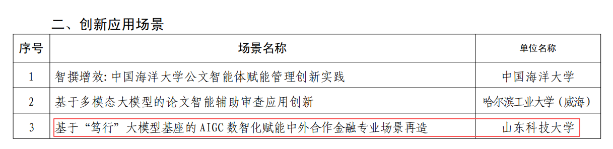 近日,山東省教育廳公布人工智能大模型賦能教育典型案例及創(chuàng)新應(yīng)用場景評選結(jié)果,由金融系湯巍老師主持的項目 “基于‘篤行’大模型基座的 AIGC 數(shù)智化賦能中外合作金融專業(yè)場景再造” 成功入選創(chuàng)新應(yīng)用場景名單,成為全省教育系統(tǒng)人工智能與教育融合創(chuàng)新的標(biāo)桿項目之一。