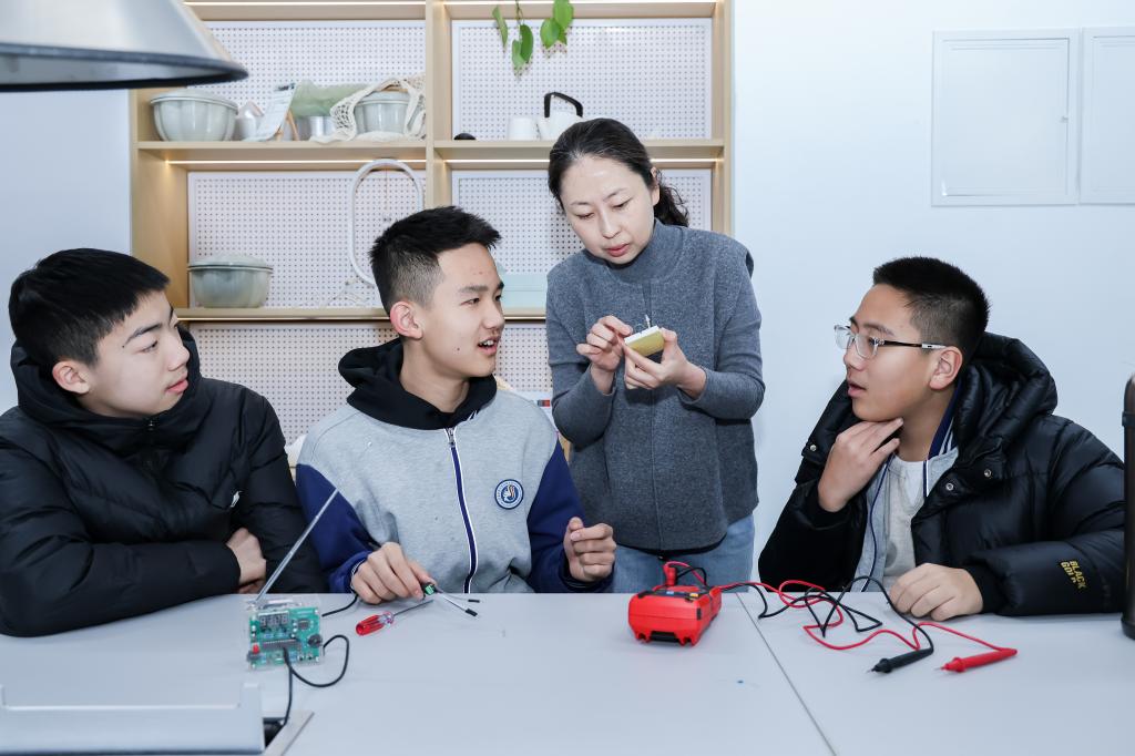 在Project工程素質(zhì)培養(yǎng)中心,牛君副教授帶領(lǐng)同學(xué)們開啟了沉浸式科技探索之旅。同學(xué)們近距離觀摩了在校本科生自主研發(fā)的機(jī)器人、小型收音機(jī)等科創(chuàng)成果,充分感受了高校學(xué)子的創(chuàng)新思維與實踐能力,現(xiàn)場交流氛圍熱烈。在實踐體驗環(huán)節(jié),牛教授細(xì)致指導(dǎo)同學(xué)們在面包板上完成電阻、LED燈等組裝工作,借助電學(xué)原理成功實現(xiàn)紅、綠、黃三色點亮。同學(xué)們分組協(xié)作、動手實操,在實踐中深化了對物理知識的理解,切實體悟到工程制作的嚴(yán)謹(jǐn)性與科技創(chuàng)新的獨特魅力。