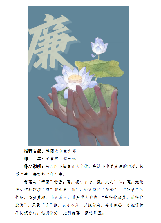 為深入學習貫徹黨的二十大精神,貫徹落實黨中央《關于加強新時代廉潔文化建設的意見》,近日,根據(jù)省委教育工委學校組織處《關于征集高校廉潔教育作品的通知》要求,機關黨總支組織開展廉潔教育作品征集活動,機關廣大黨員、職工積極響應、踴躍參與,圍繞黨員領導干部廉潔從政、教師廉潔育人、學生廉潔養(yǎng)成等內(nèi)容,提交創(chuàng)意設計、書法、征文等作品10余件。作品將優(yōu)秀傳統(tǒng)文化與廉政文化相結合,有溫度、有風骨、有力量,豐富了廉潔文化的內(nèi)容。