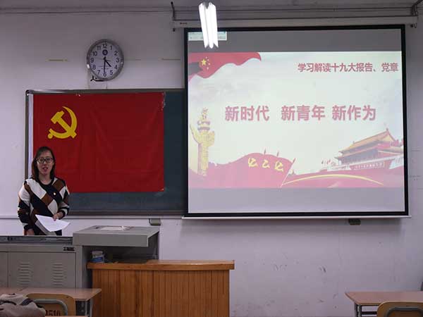 本次黨課學(xué)習(xí)主要圍繞十九大報(bào)告內(nèi)容及黨章修正案展開。齊斯文通過引導(dǎo)在座學(xué)生黨員描繪暢想“兩個一百年”的美好愿景,啟發(fā)思考在新時(shí)代下青年人擔(dān)負(fù)的歷史使命,將大家引入黨課第一章內(nèi)容“十九大會議主題、議程、意義”,通過援引十九大山東代表團(tuán)一線代表的參會經(jīng)歷,生動講述了“初心與使命”的內(nèi)涵,并強(qiáng)調(diào)要內(nèi)化于心、外化于行。隨后,齊斯文通過回顧十九大部分節(jié)選的黨章修正案,對比分析了黨在不同時(shí)期下的理論創(chuàng)新及豐碩實(shí)踐成果。她具體講解了黨章新增設(shè)的主要內(nèi)容,使在場黨員系統(tǒng)、清晰的了解了中國特色社會主義新時(shí)代背景下黨的指導(dǎo)思想、基本方略、黨的建設(shè),以及社會的主要矛盾、中國特色社會主義文化的戰(zhàn)略地位等內(nèi)容,明確了在實(shí)現(xiàn)中華民族偉大復(fù)興中國夢的奮斗目標(biāo)中青年人大有可為、大有作為。