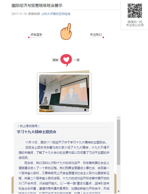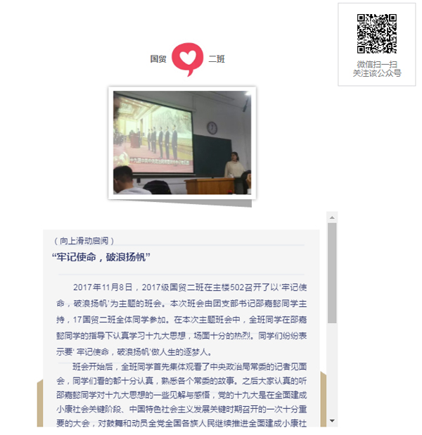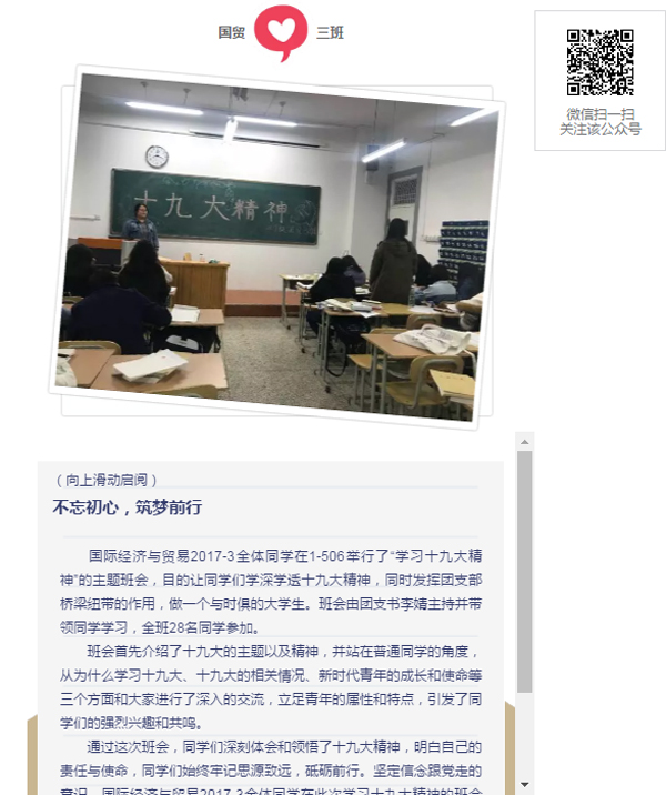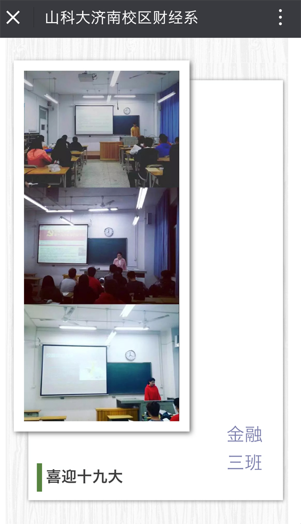 財經(jīng)系團(tuán)總支召開由班長、團(tuán)支部書記與學(xué)生會主要學(xué)生干部參加的學(xué)習(xí)會。要求全體學(xué)生認(rèn)真學(xué)習(xí)貫徹黨的十九大精神,積極參與實踐活動,自覺擔(dān)當(dāng)時代責(zé)任;團(tuán)學(xué)干部要樹立榜樣,營造全體學(xué)生“知十九大、學(xué)十九大、宣傳十九大”的良好氛圍;要結(jié)合十九大精神的學(xué)習(xí)和討論,開展好學(xué)生會與團(tuán)支部活動,增強團(tuán)組織的凝聚力與活力。