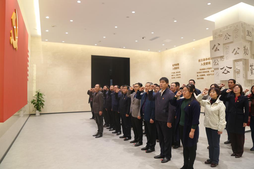 在宣誓廳,校區(qū)黨委工作部主任仉興泉帶領(lǐng)大家面對(duì)黨旗,重溫入黨誓詞,進(jìn)行莊嚴(yán)宣誓,感悟入黨初心、堅(jiān)定理想信念。